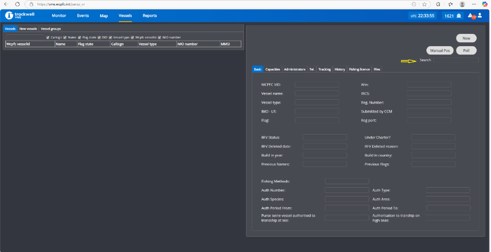 Step 3: Searching for vessels on Trackwell. The Vessels tab provides a search box where the vessel name can be entered, and the current position can be displayed if it is currently reporting to the WPCFC VMS. Make sure you provide the name exactly as it appears on the RFV. Click on the Vessels tab and enter the vessel name in search box (see below):