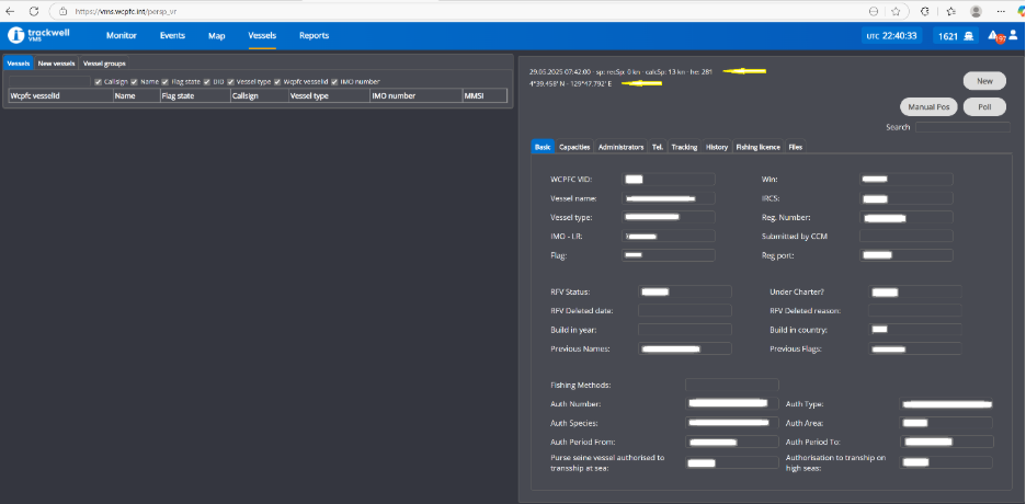 After signing in, authorized users can search for vessels, view recent tracks and timestamps, and apply filters/time windows to support monitoring and compliance tasks. If positions are missing or delayed, users should first check the VRST to see whether the vessel shows as STOP. They can then contact vms@wcpfc.int if the Secretariat has not already reached out regarding actions to re-establish routine reporting, and/or contact the service provider as relevant.