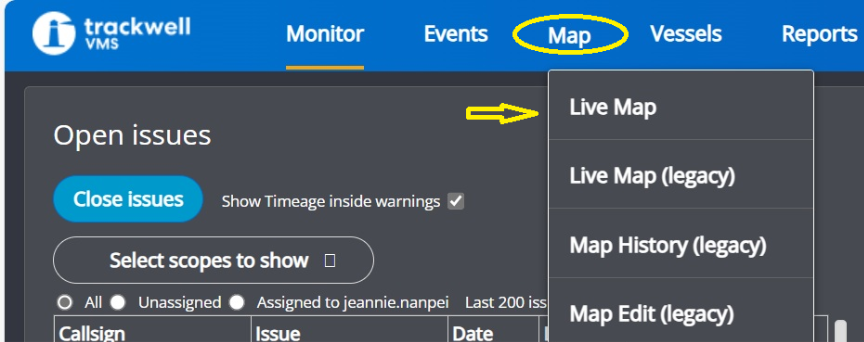 Step 4: The Vessel’s recent reported positions will appear in the area highlighted with the yellow arrows