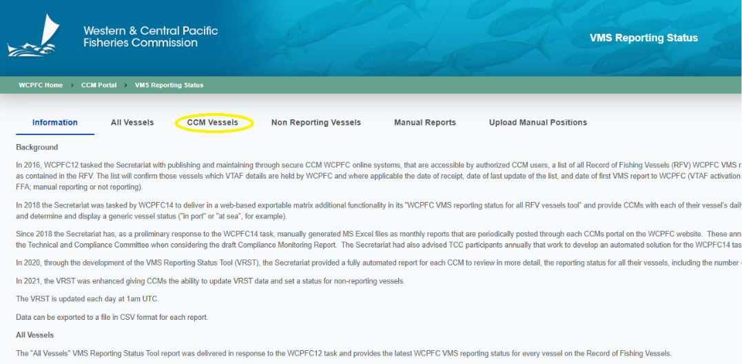 VRST automates a previously manual process, supports CSV export, and lets users update or set the reporting status for nonreporting vessels to support compliance monitoring. The tool provides three report views: All Vessels (latest status for every RFV vessel), CCM Vessels (vessels flagged to the logged in CCM, with expected reporting via FFA VMS or WCPFC MTU and daily counts over the past 14 days), and Non Reporting Vessels (vessels expected to report but not sending data; VMS Editors can set In Port or Outside the Convention Area with an effective date, and the status resets automatically once VMS data is received).