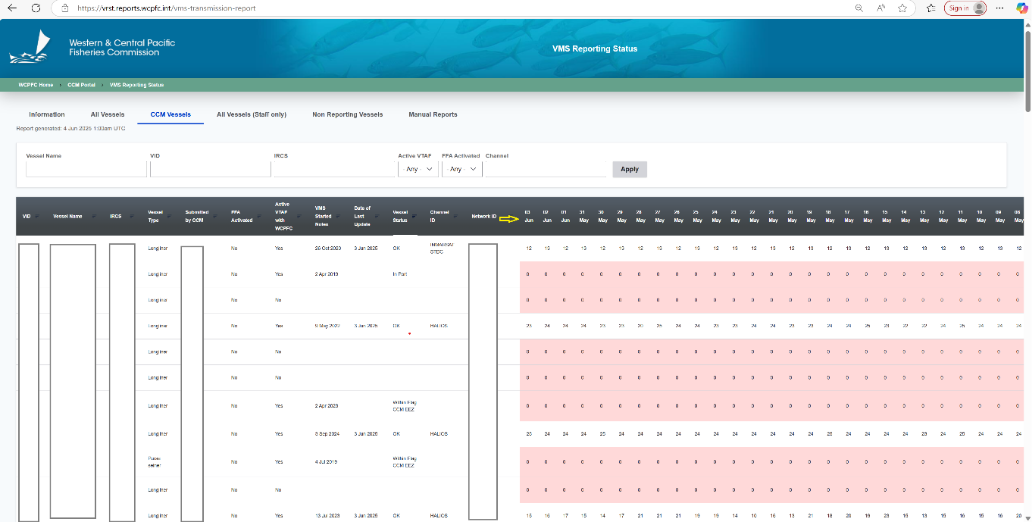 The VMS Reporting Status Tool (VRST) is a secure, online system that gives authorized CCMs current information on the VMS reporting status of all vessels on the RFV, showing how many position reports each vessel transmits daily, the current reporting channel (WCPFC direct, through FFA, manual, or not reporting), and a general status such as “in port” or “at sea”; vessel status is updated once a day (around midday Pohnpei time) and the system updates daily at 1:00 a.m. UTC.