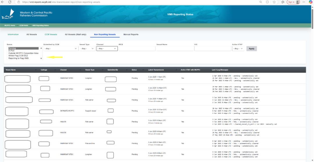 Step 4: For vessels that are non-reporting for more than 30 days navigate to the non-reporting vessels tab to set the vessel status. Vessel status as listed as Pending: Temporary placeholder until a VMS Editor selects the correct status. In Port: The vessel is in port. Outside the Convention Area: The vessel is operating outside the WCPFC Convention Area. Within Flag CCM EEZ: The vessel is operating within its flag State EEZ. Reporting to Flag VMS: The vessel is reporting via the flag State VMS (e.g., via the FFA VMS) rather than directly to WCPFC.
